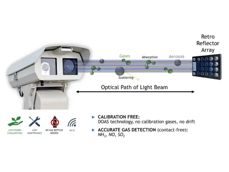This system enables precise Open Path DOAS measurements of ammonia (NH₃) across multiple paths using multiple retro reflectors.